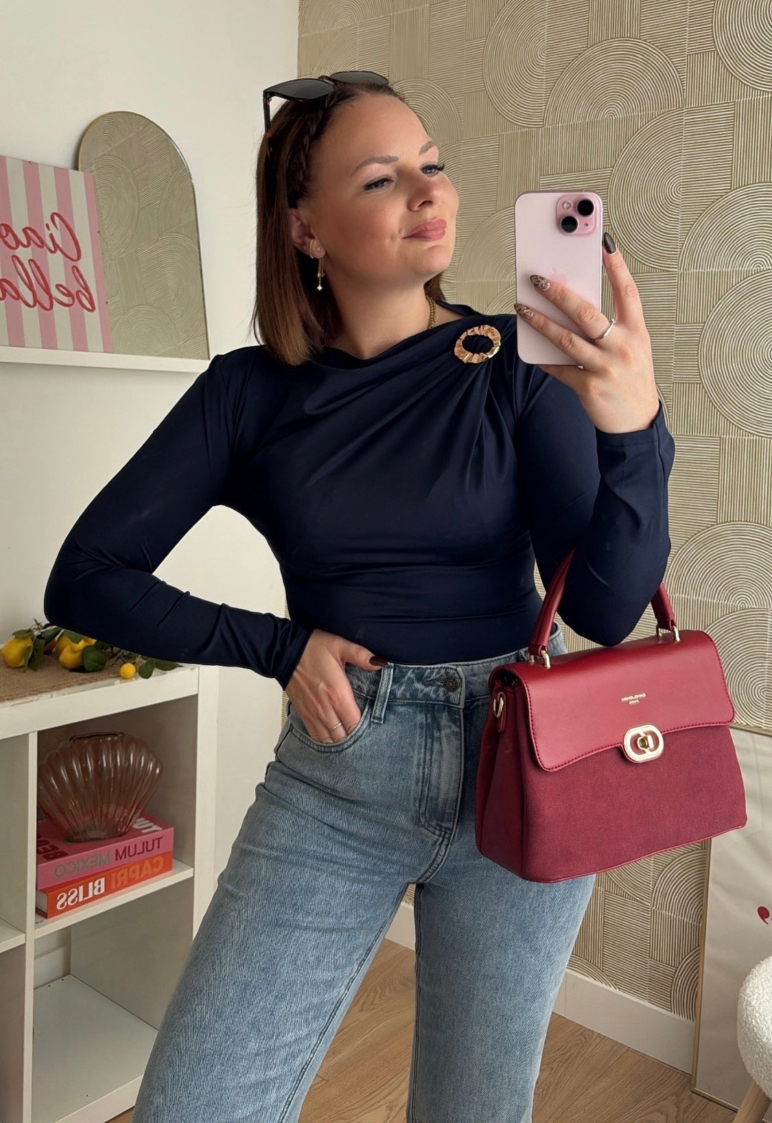 Élégant et sophistiqué, ce body séduit par son encolure drapée délicate, sublimée d’une boucle décorative dorée sur l’épaule. Ses manches longues droites lui donnent une allure chic et raffinée, idéale pour briller en soirée ou sublimer un look du quotidien.
