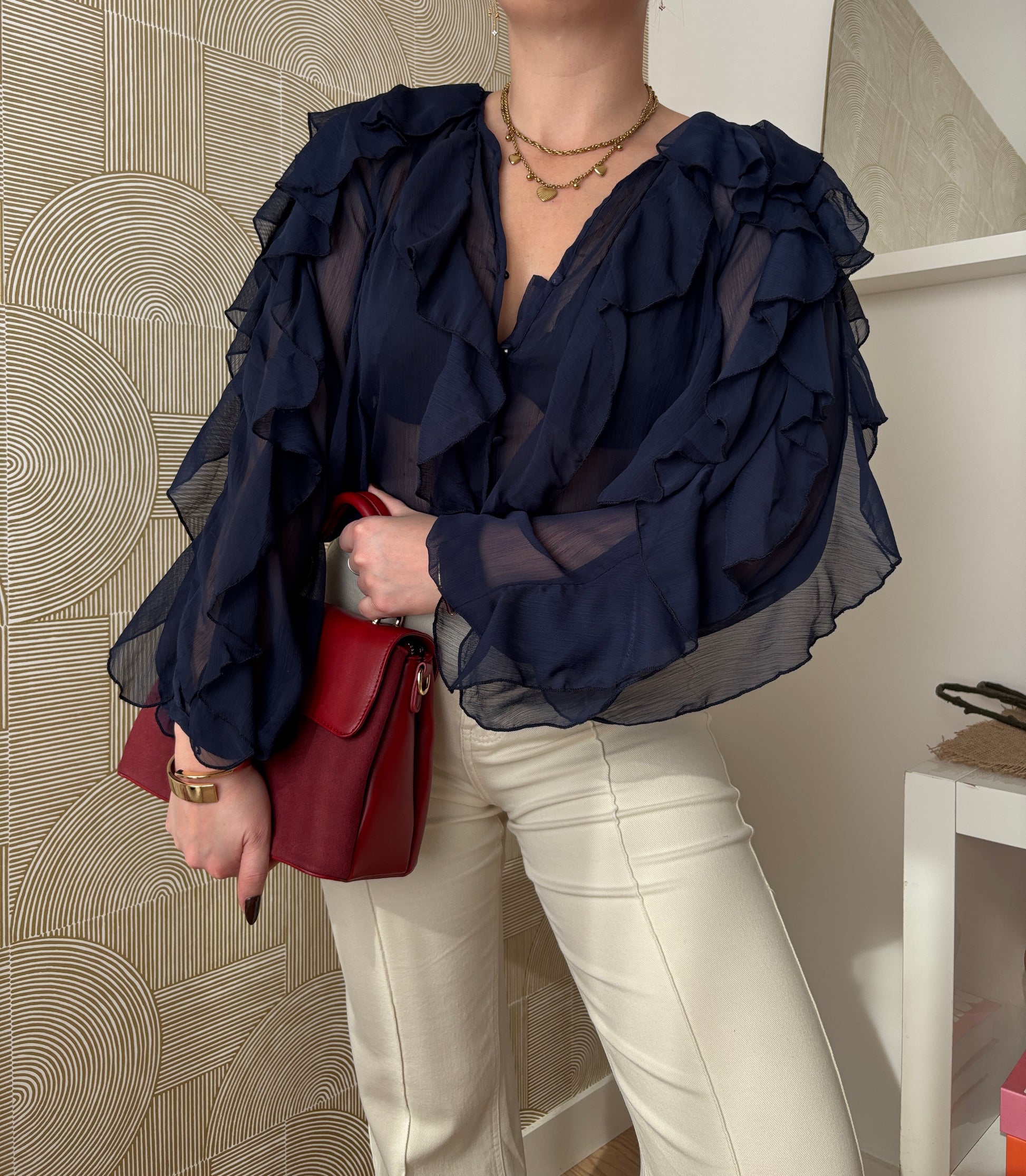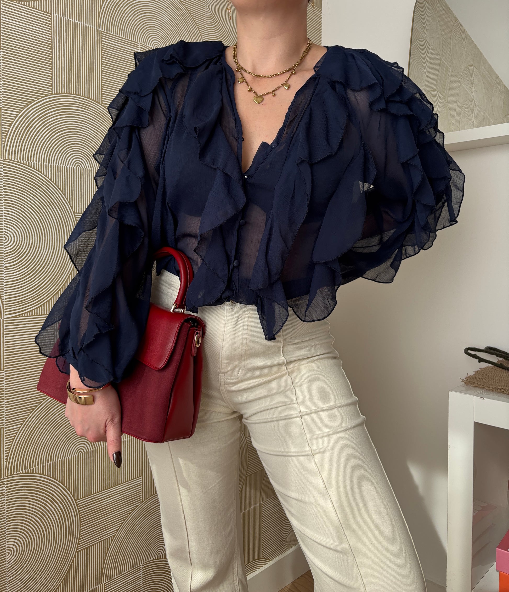 Élégant et féminin, ce chemisier séduit par ses froufrous délicats et sa légère transparence. Ses manches resserrées apportent une touche chic, tandis que les boutons tout le long offrent une allure sophistiquée et intemporelle.