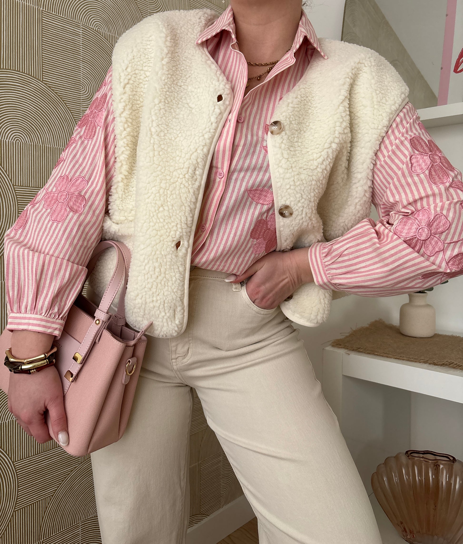 Ses fines rayures roses associées aux motifs fleurs apportent une touche douce et élégante, parfaite pour le quotidien comme pour une tenue plus habillée. Sa coupe confortable et intemporelle en fait une pièce facile à porter et à associer, saison après saison.