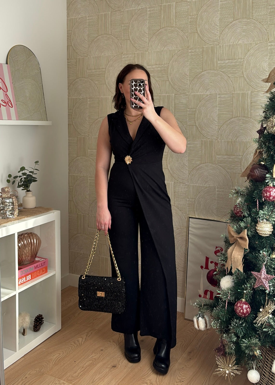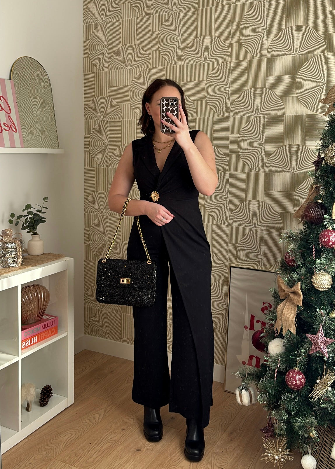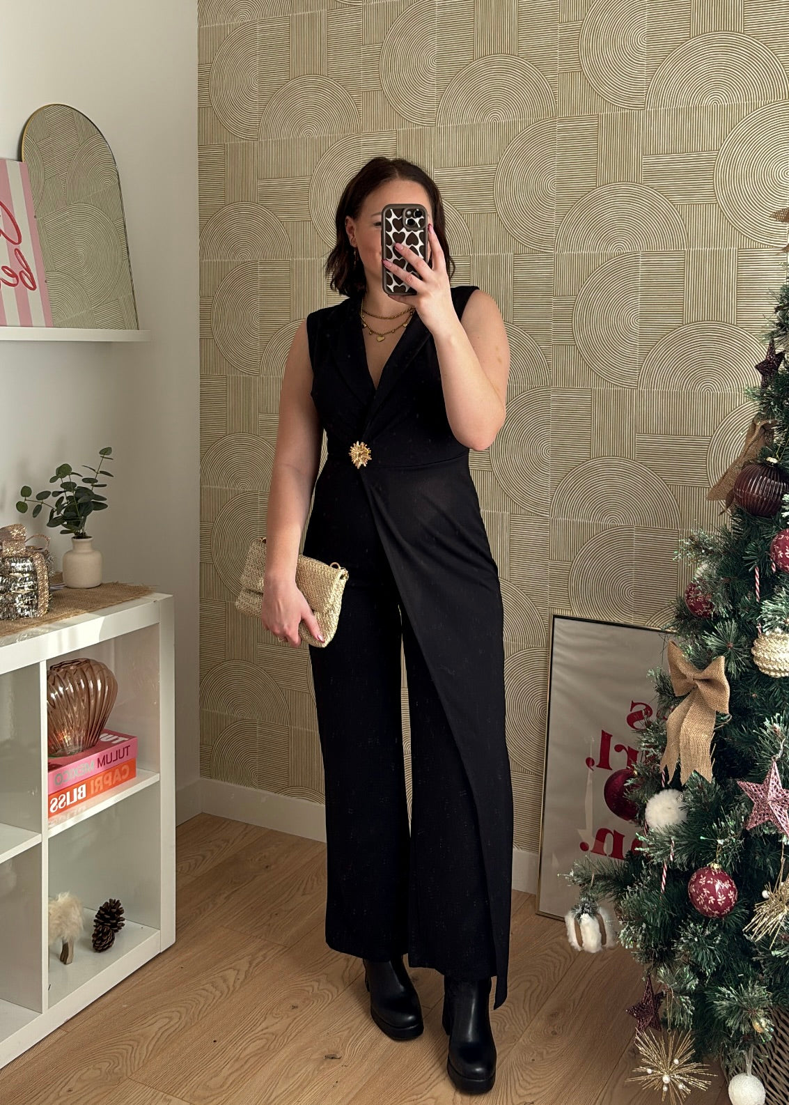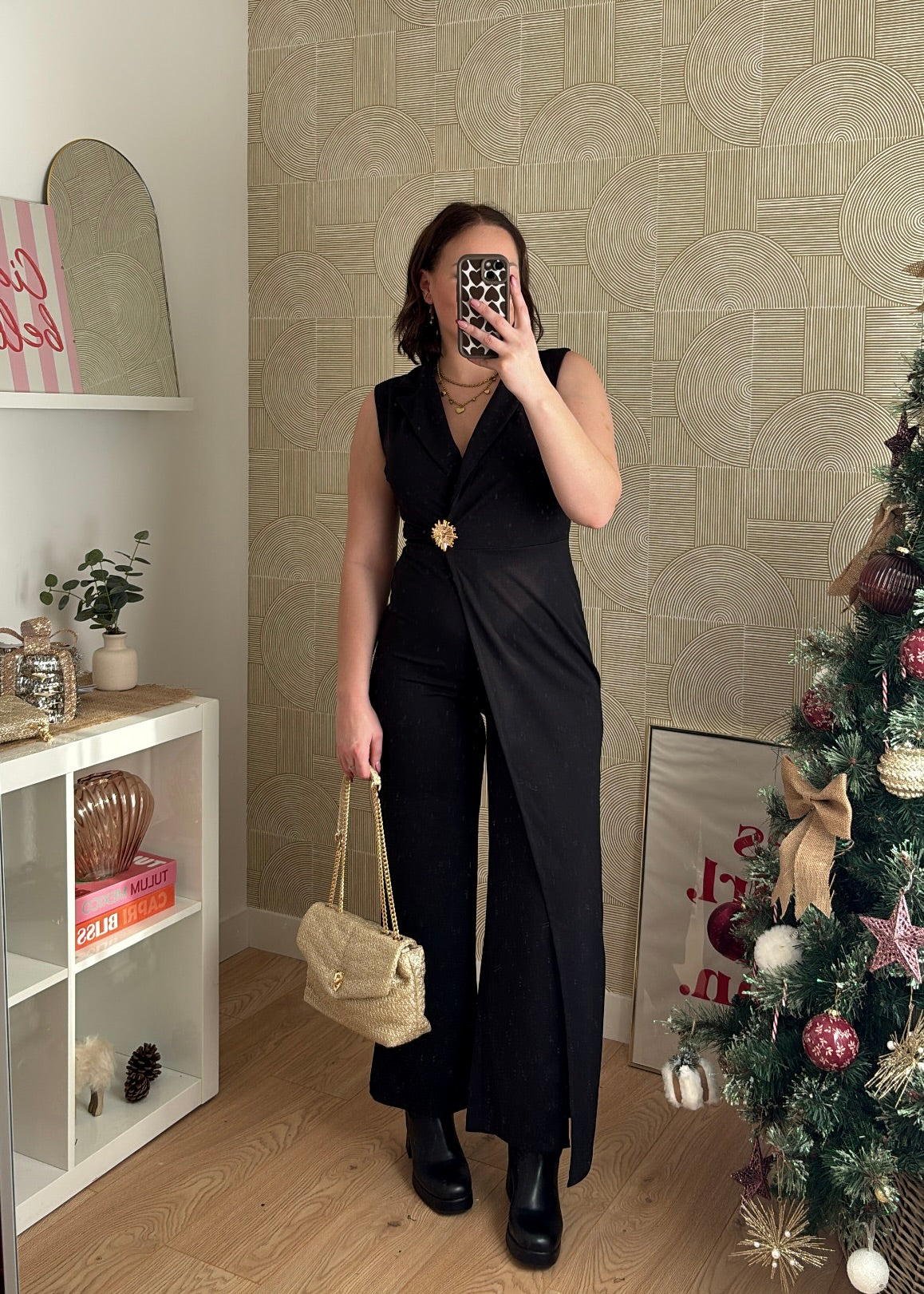 Sa coupe fluide flatte la silhouette, tandis que son col blazer et son bouton bijou ajoutent une touche élégante. L’ouverture subtile sur une jambe apporte un effet moderne et sophistiqué, idéal pour les fêtes ou une soirée.