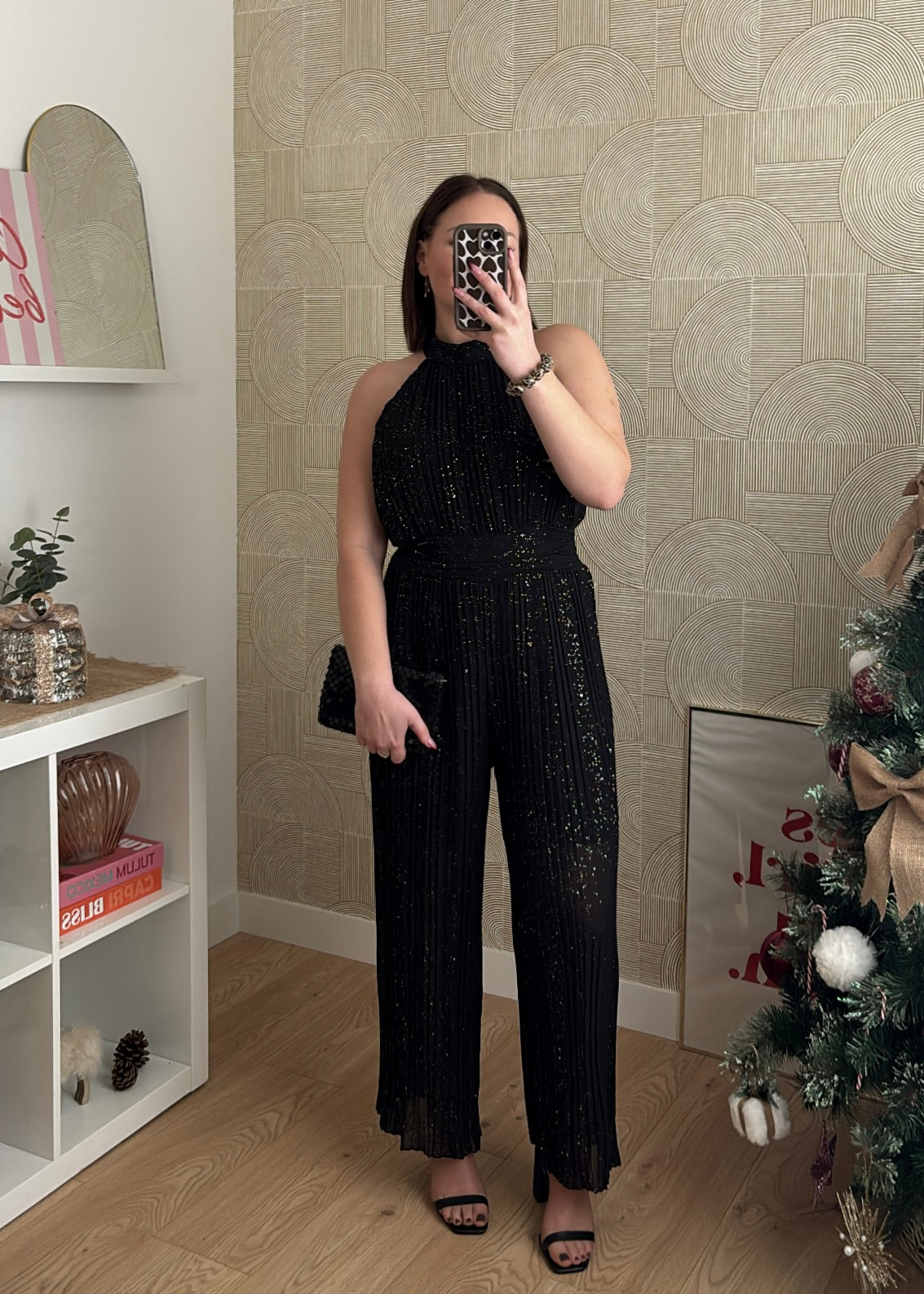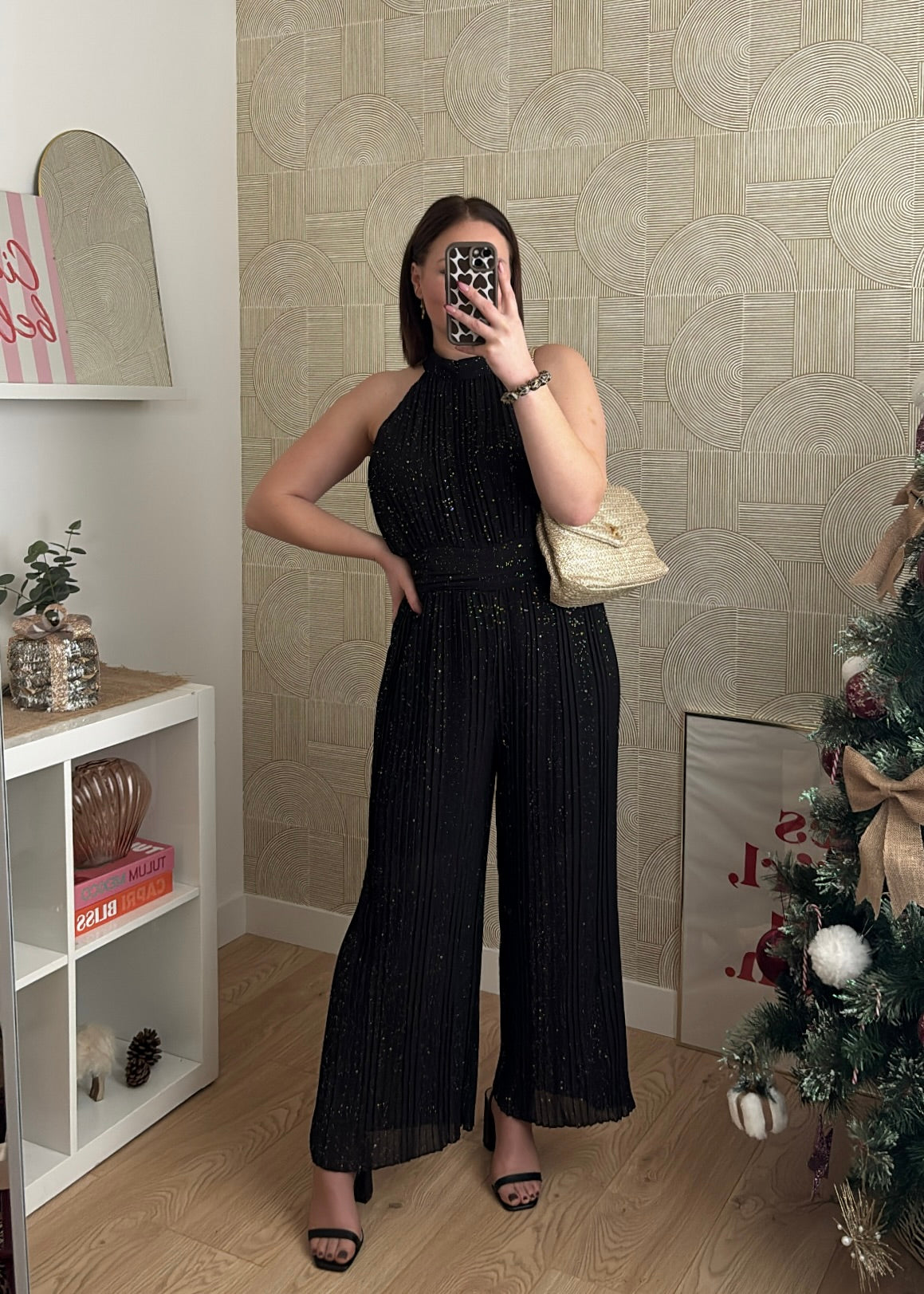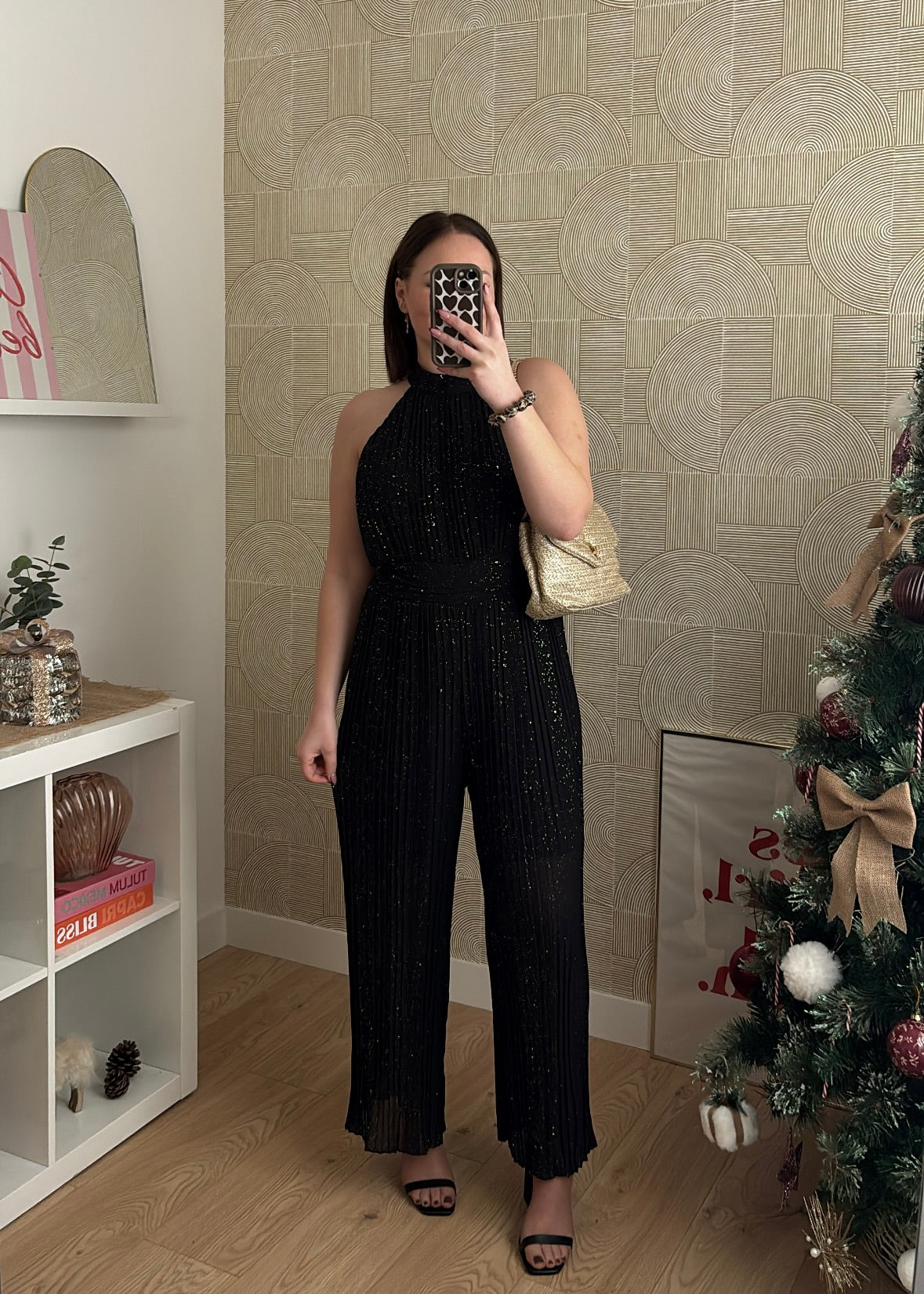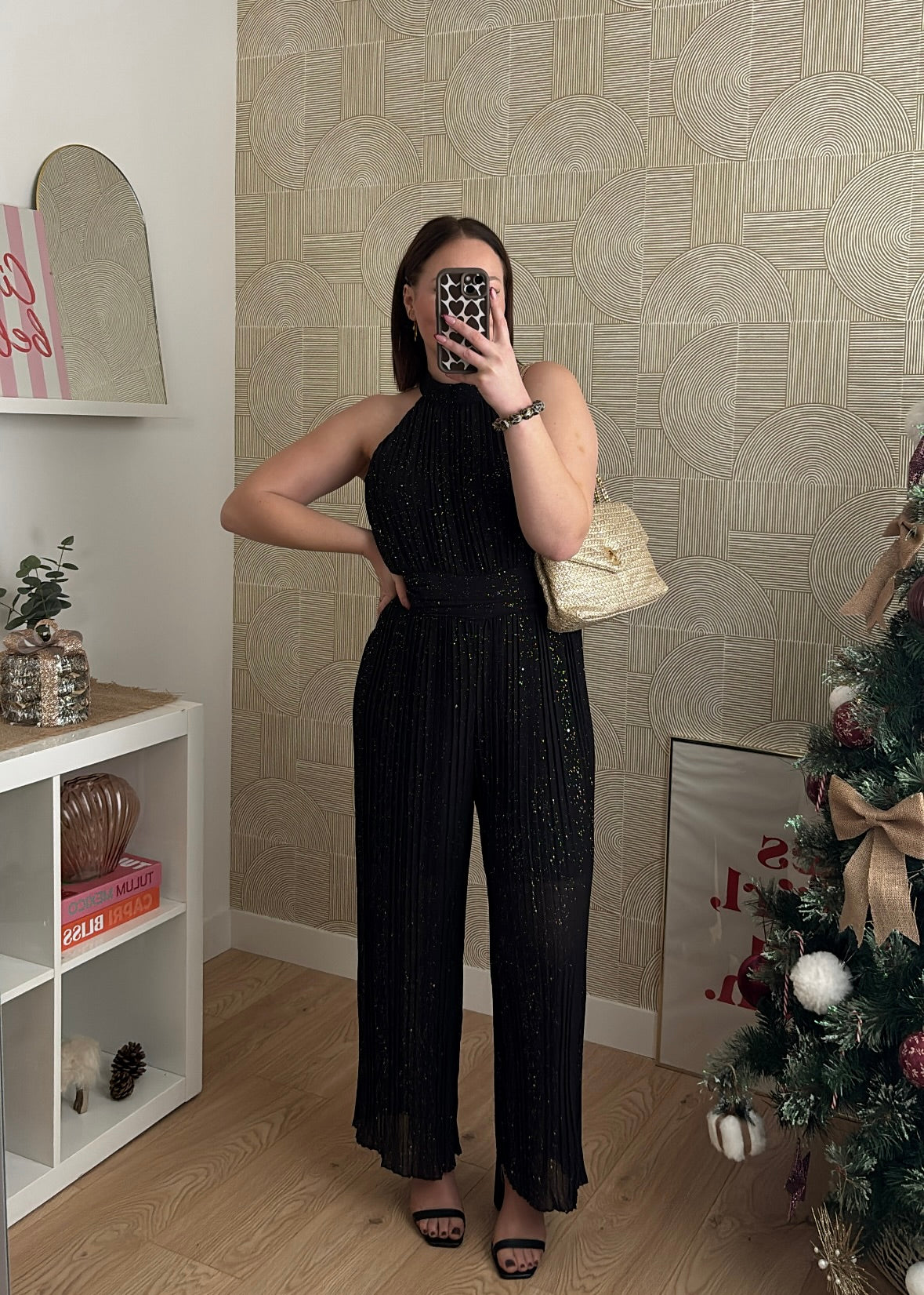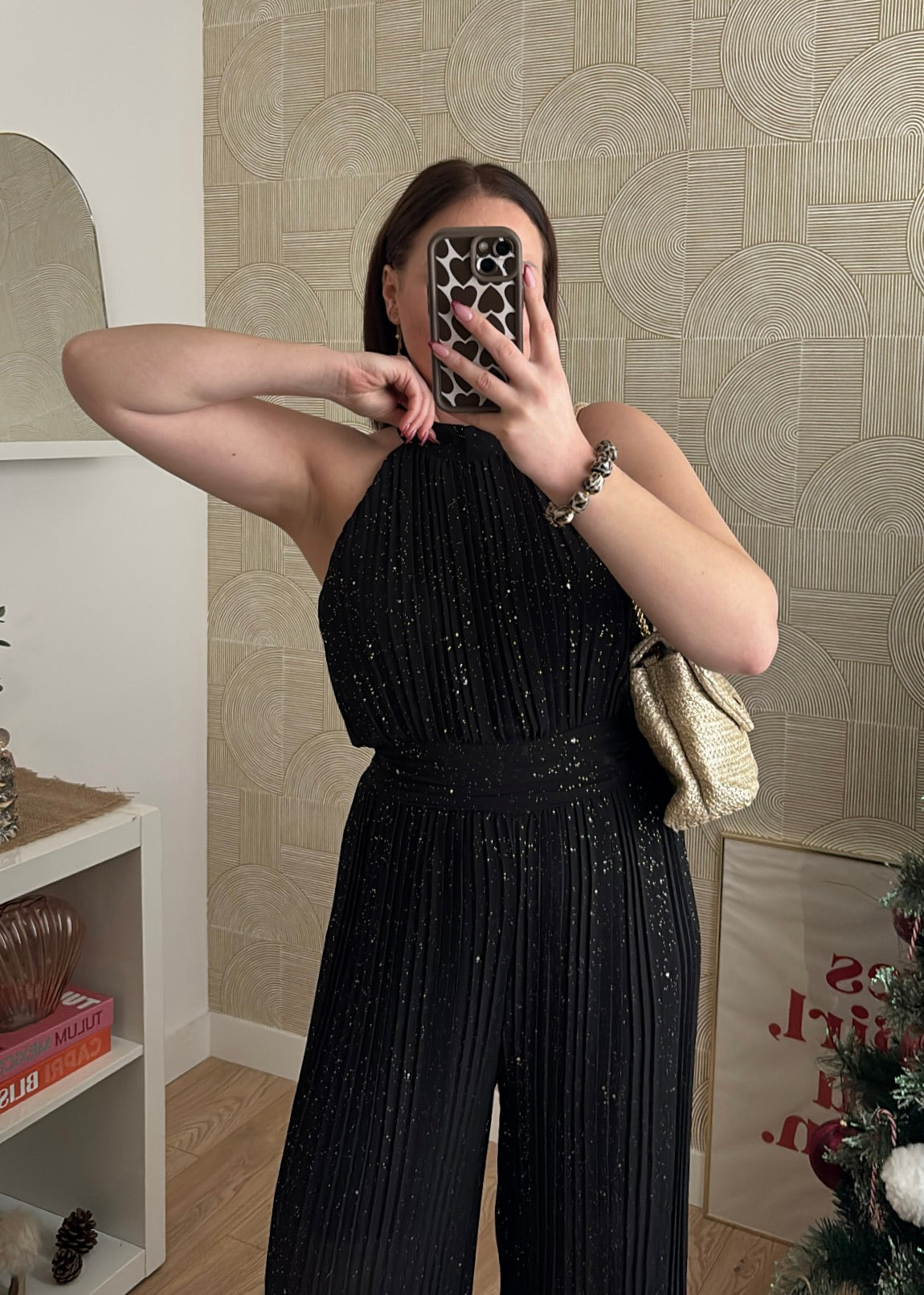Son tissu plissé fluide parsemé de fines paillettes dorées apporte un effet lumineux sans en faire trop. Le col halter met en valeur les épaules, la taille est marquée pour allonger la silhouette et le pantalon large offre une allure chic et confortable. Une pièce idéale pour les fêtes, une soirée ou un événement habillé.