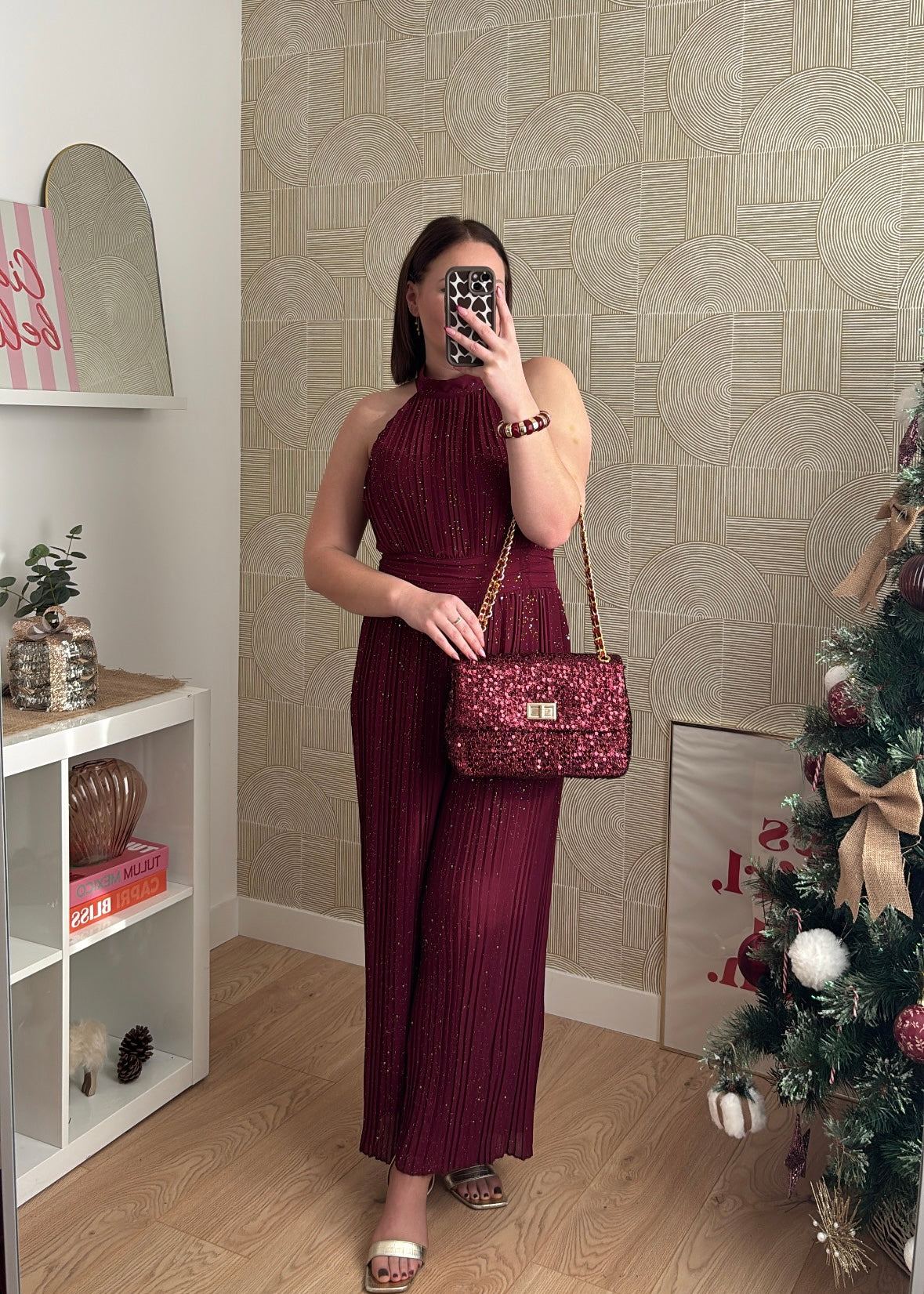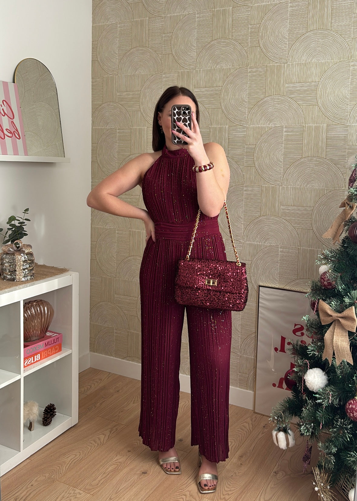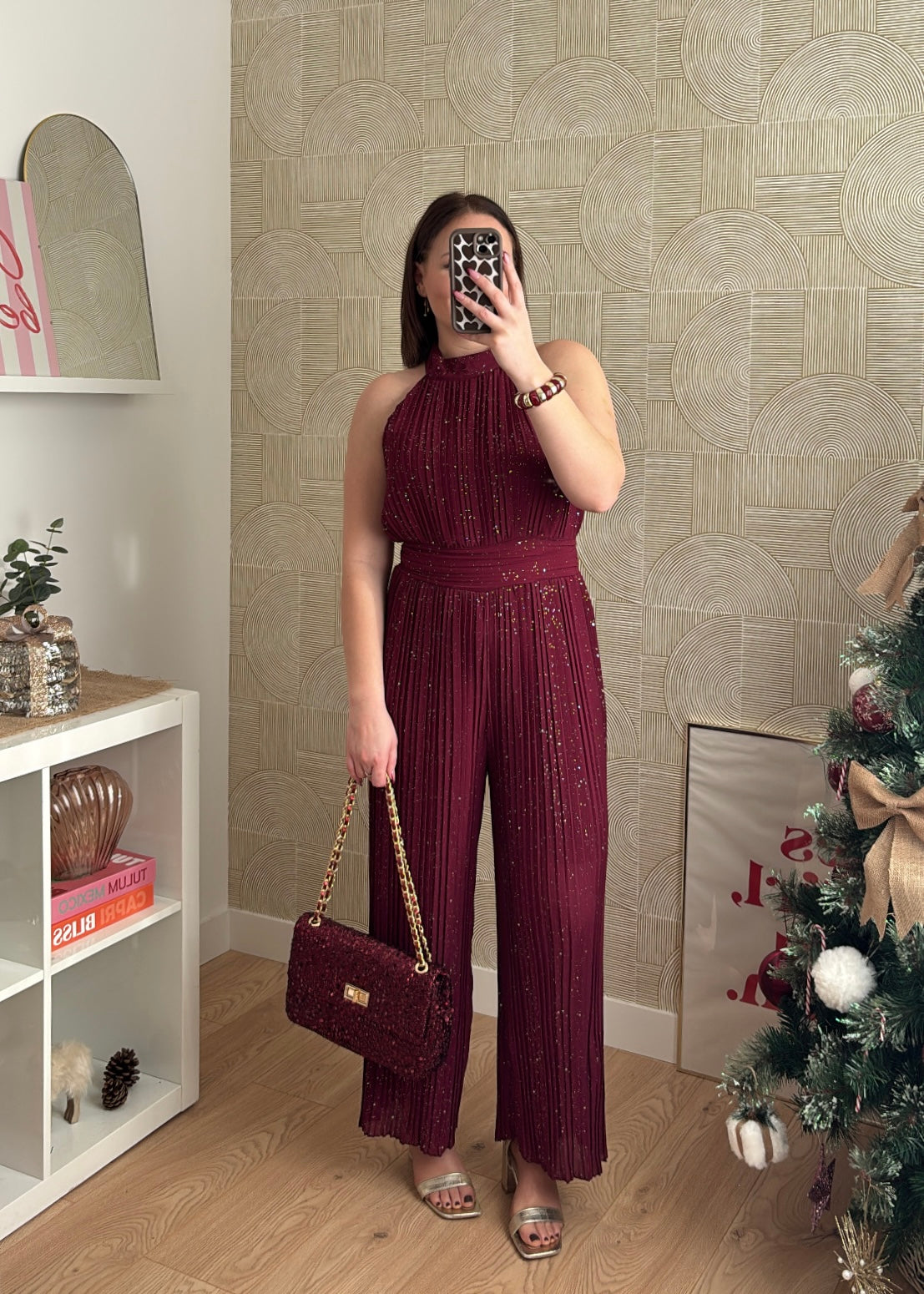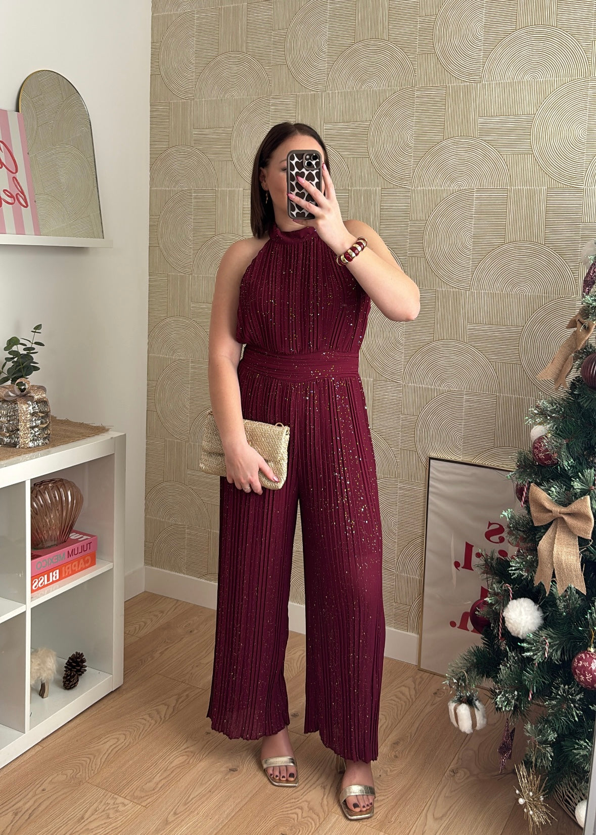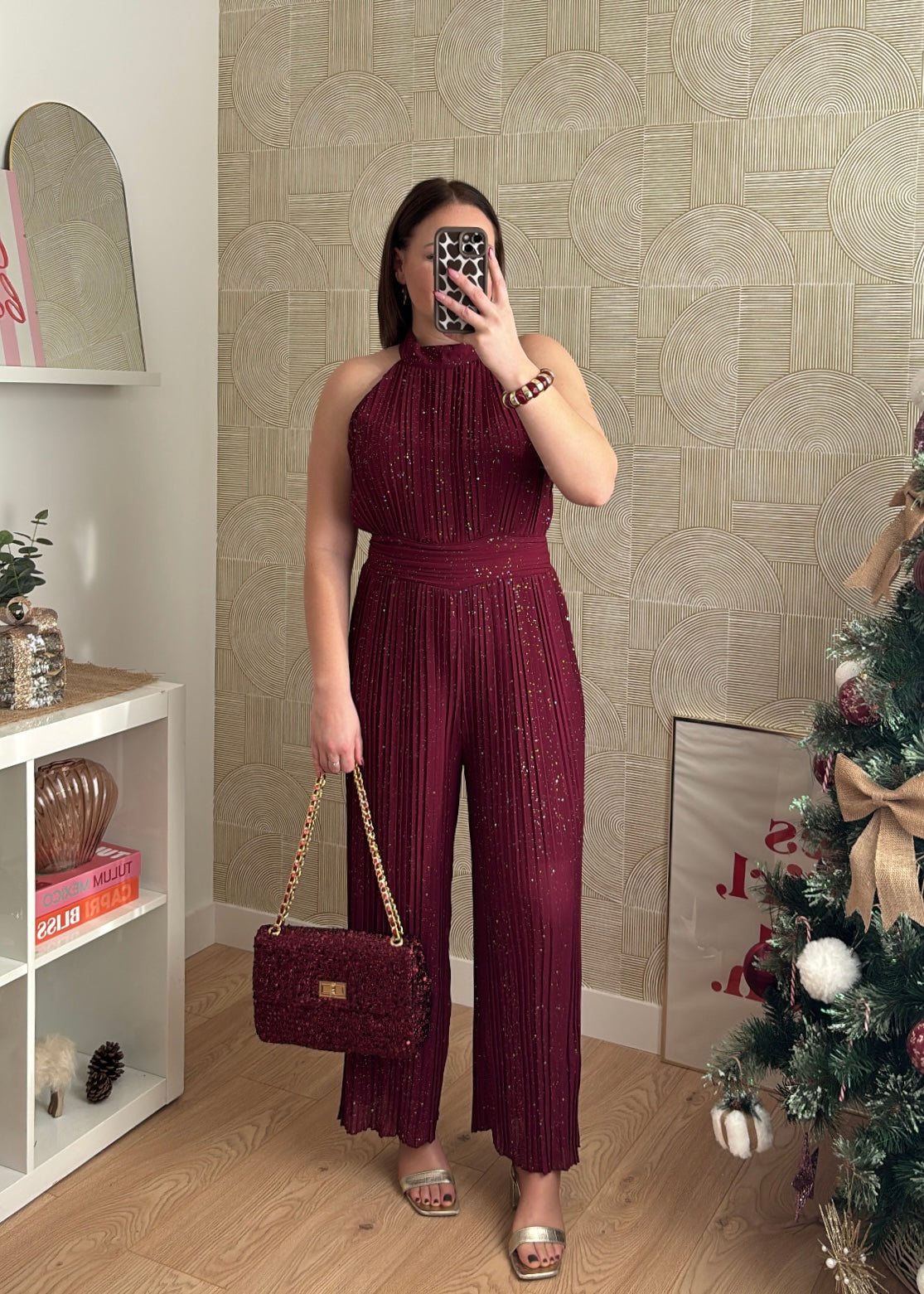 Son tissu plissé fluide parsemé de fines paillettes dorées apporte un effet lumineux sans en faire trop. Le col halter met en valeur les épaules, la taille est marquée pour allonger la silhouette et le pantalon large offre une allure chic et confortable. Une pièce idéale pour les fêtes, une soirée ou un événement habillé.