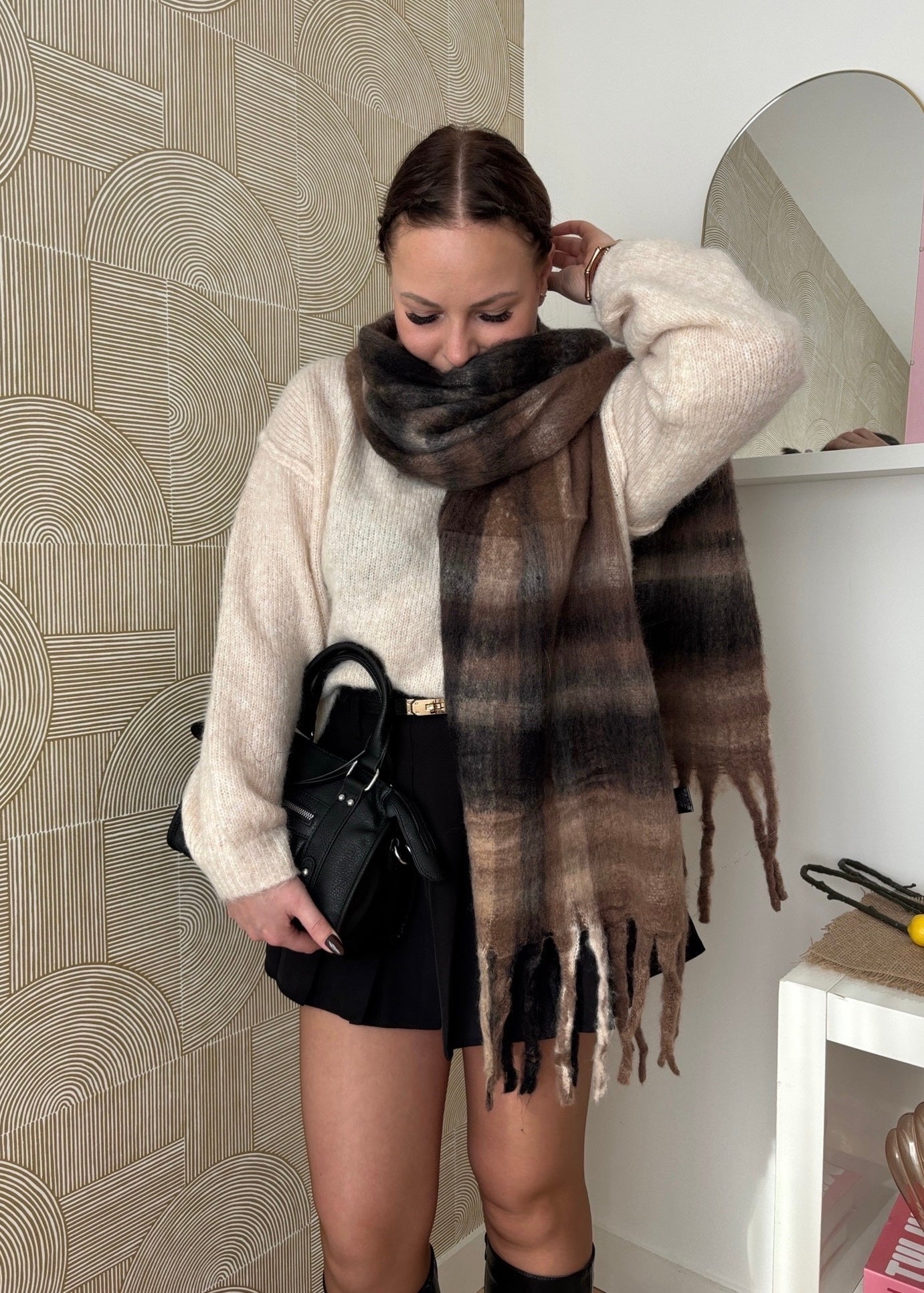 On craque pour son dégradé de tons bruns et beiges, sa texture duveteuse et son grand format idéal pour s’envelopper confortablement. Un indispensable cocooning qui s’accorde à merveille avec un manteau, un pull ou un perfecto 🤍