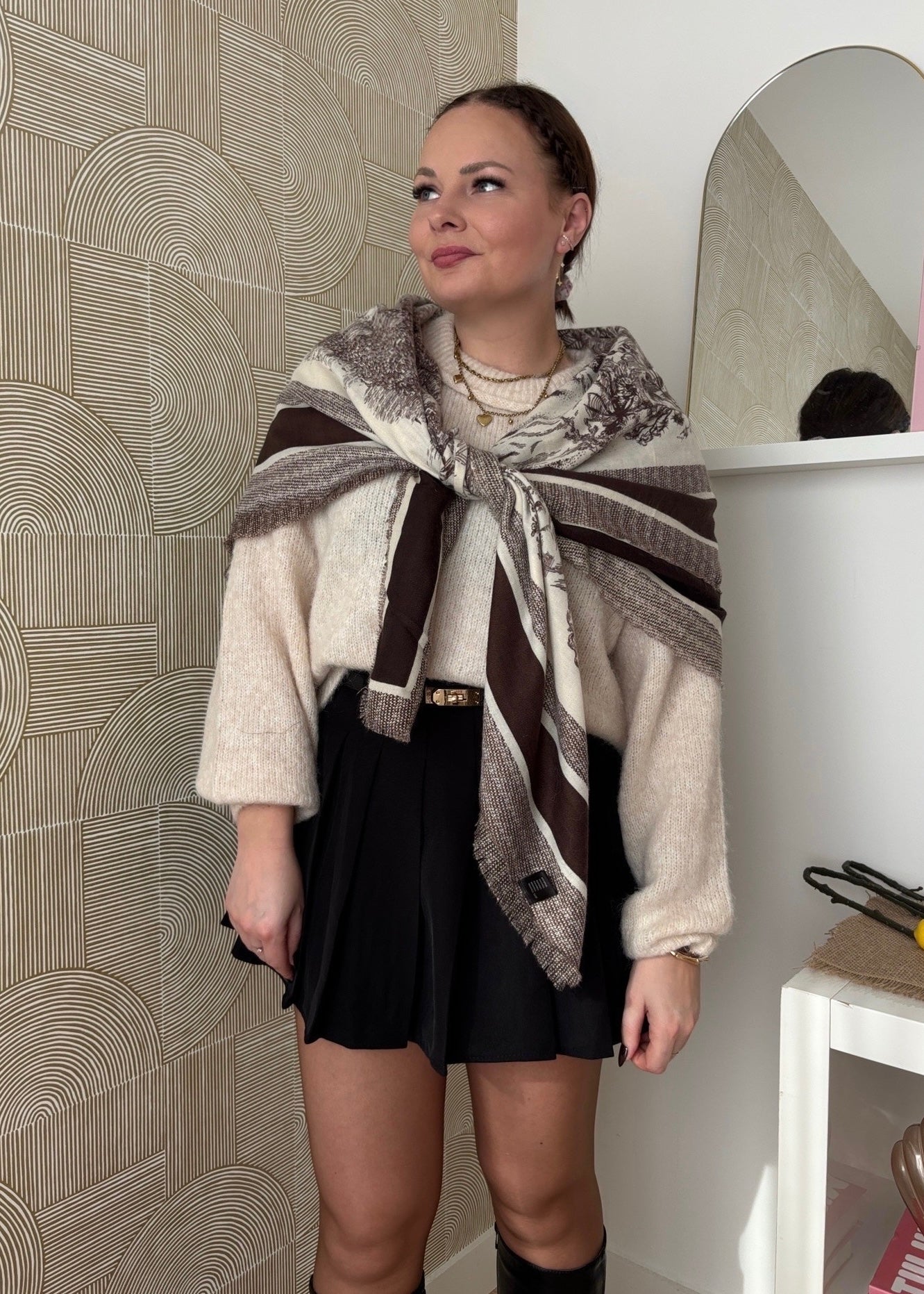 Élégante et raffinée, cette écharpe fluide marie des nuances de chocolat profond et de beige doux pour un rendu chic et intemporel 🍂