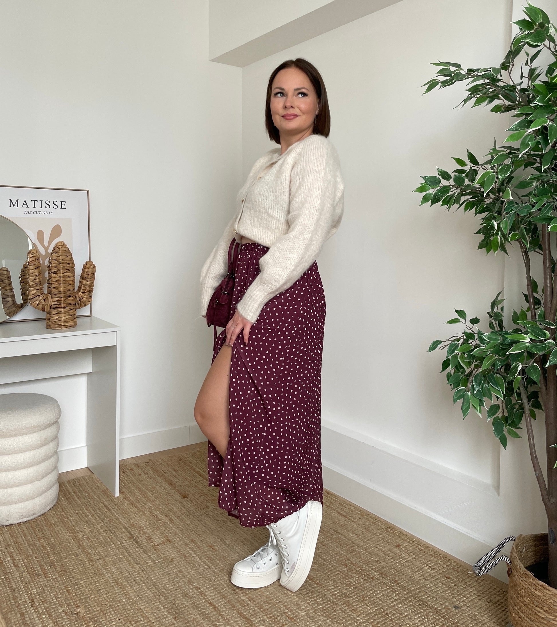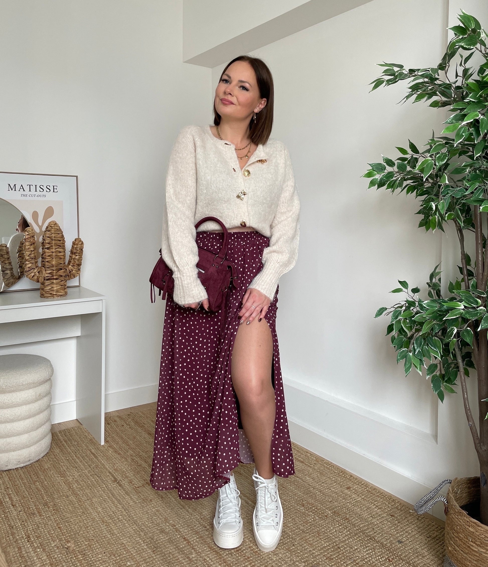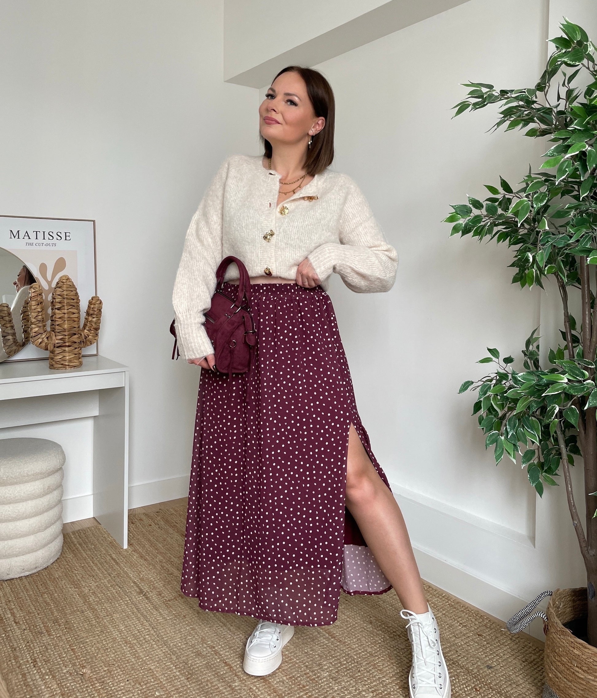 Souple et féminine, cette jupe longue à pois est idéale pour la saison. Sa coupe fluide et sa fente apportent élégance et confort au quotidien.
