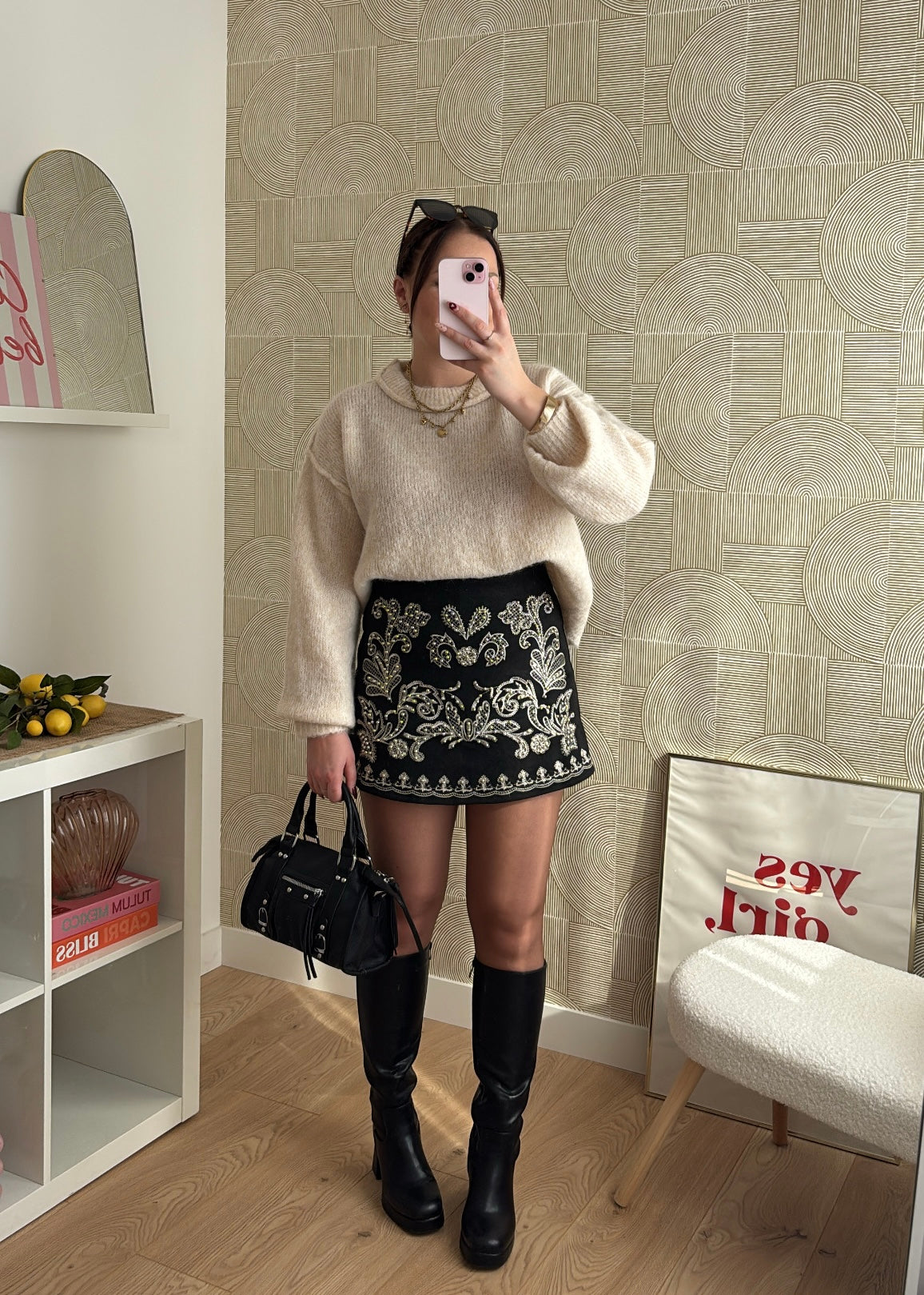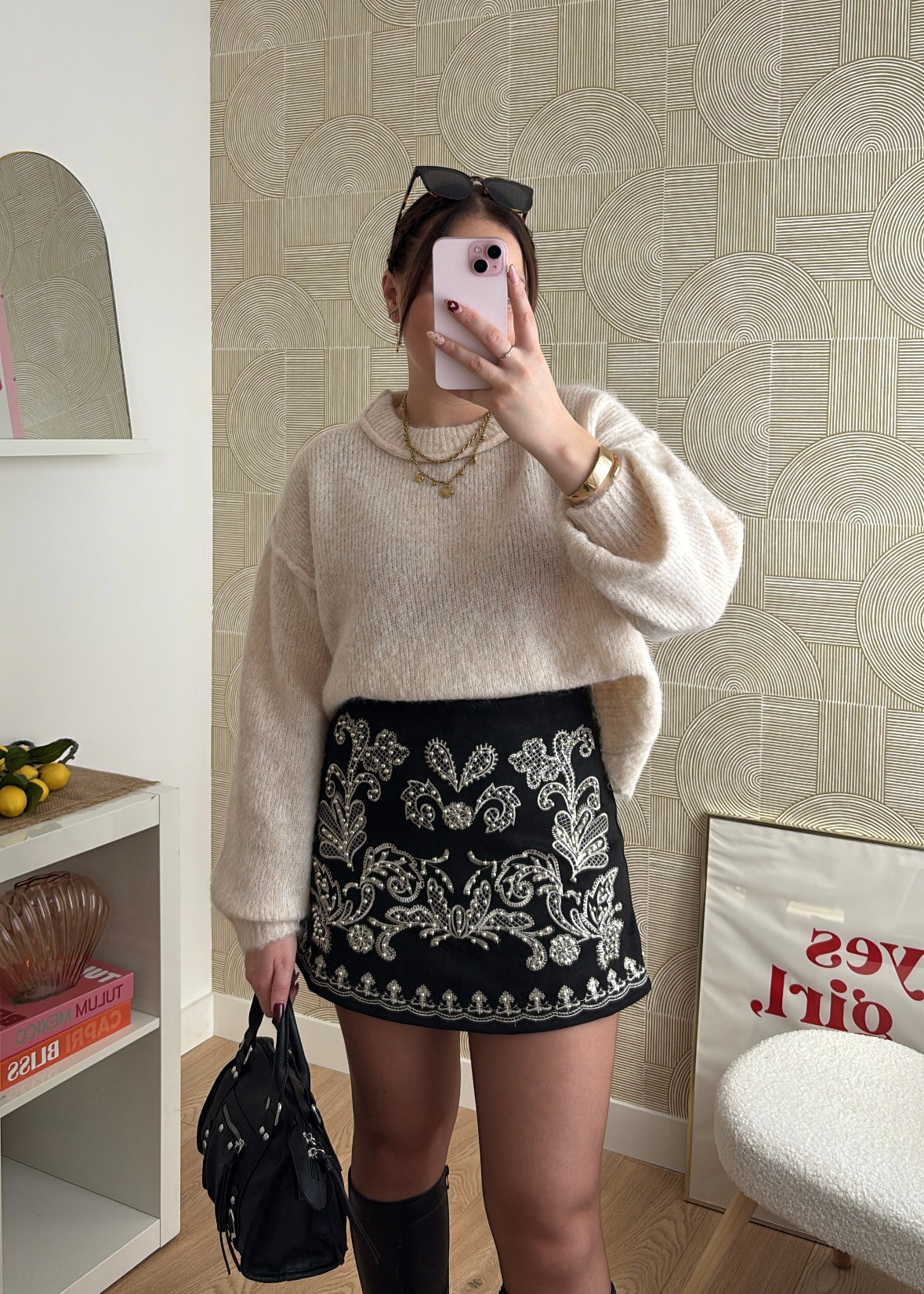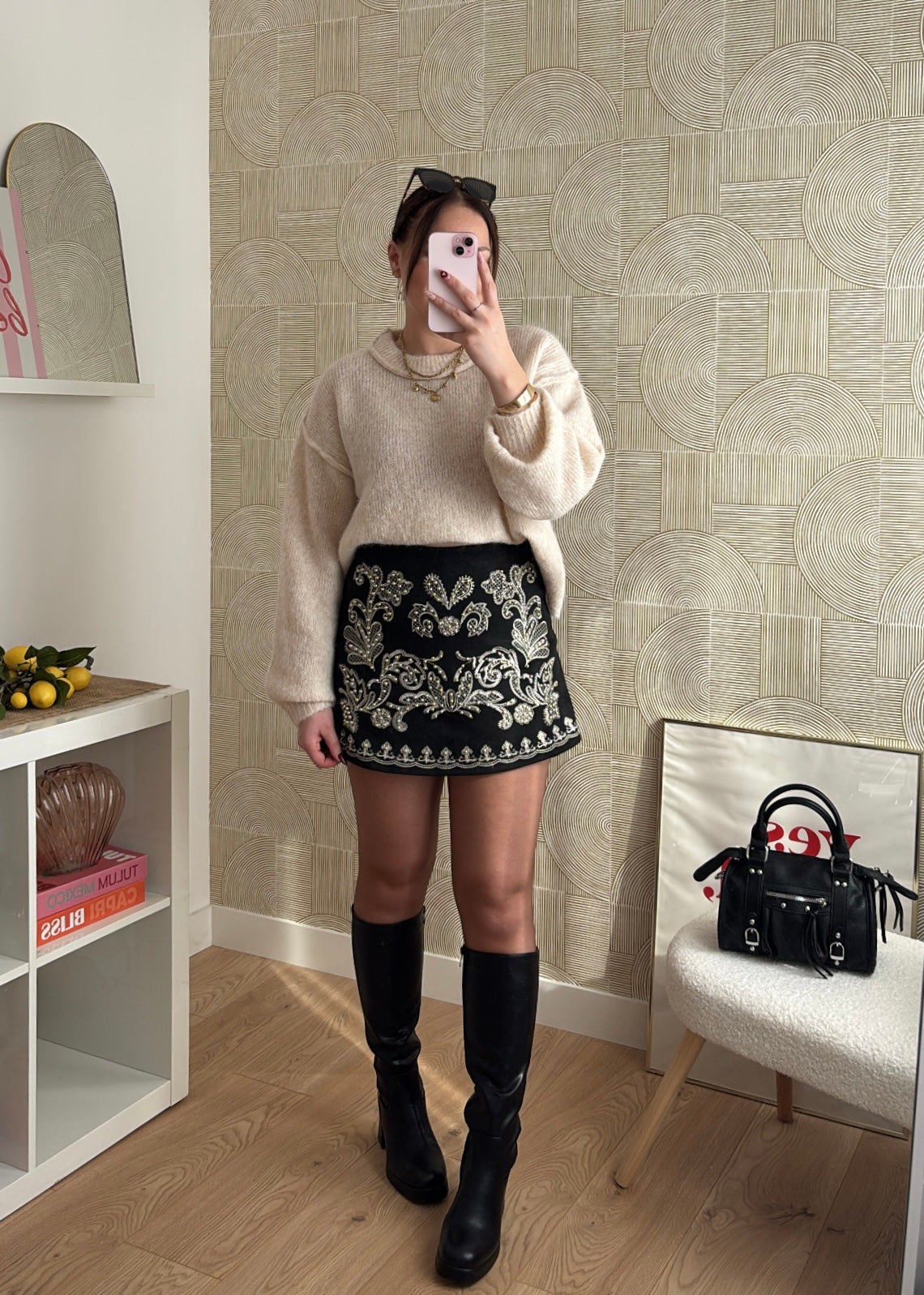 ✨ Jupe-short brodée noire à détails dorés