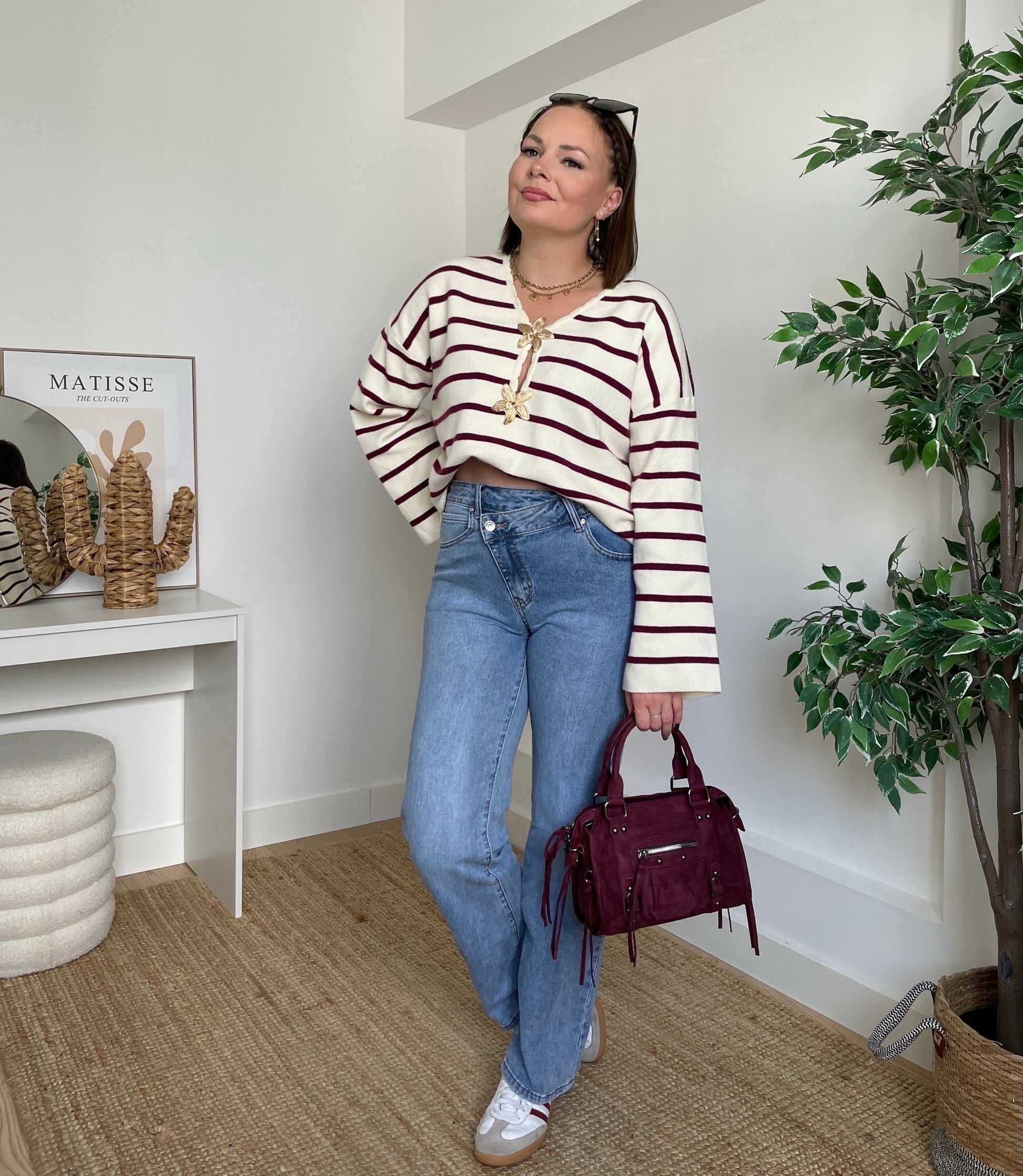 Apportez une touche chic et originale à vos tenues avec ce pull style marinière, orné de deux gros boutons dorés originaux sur le devant.