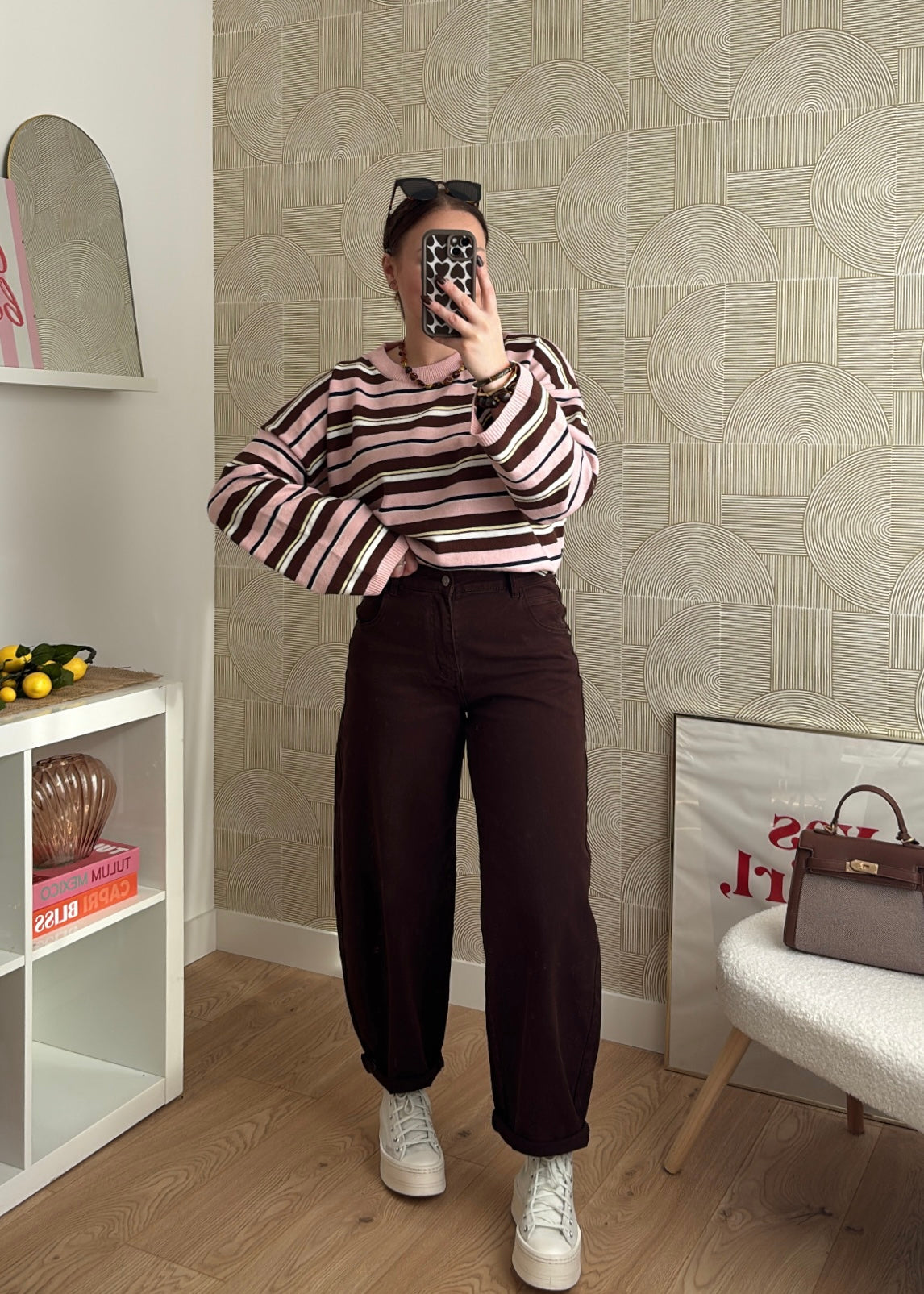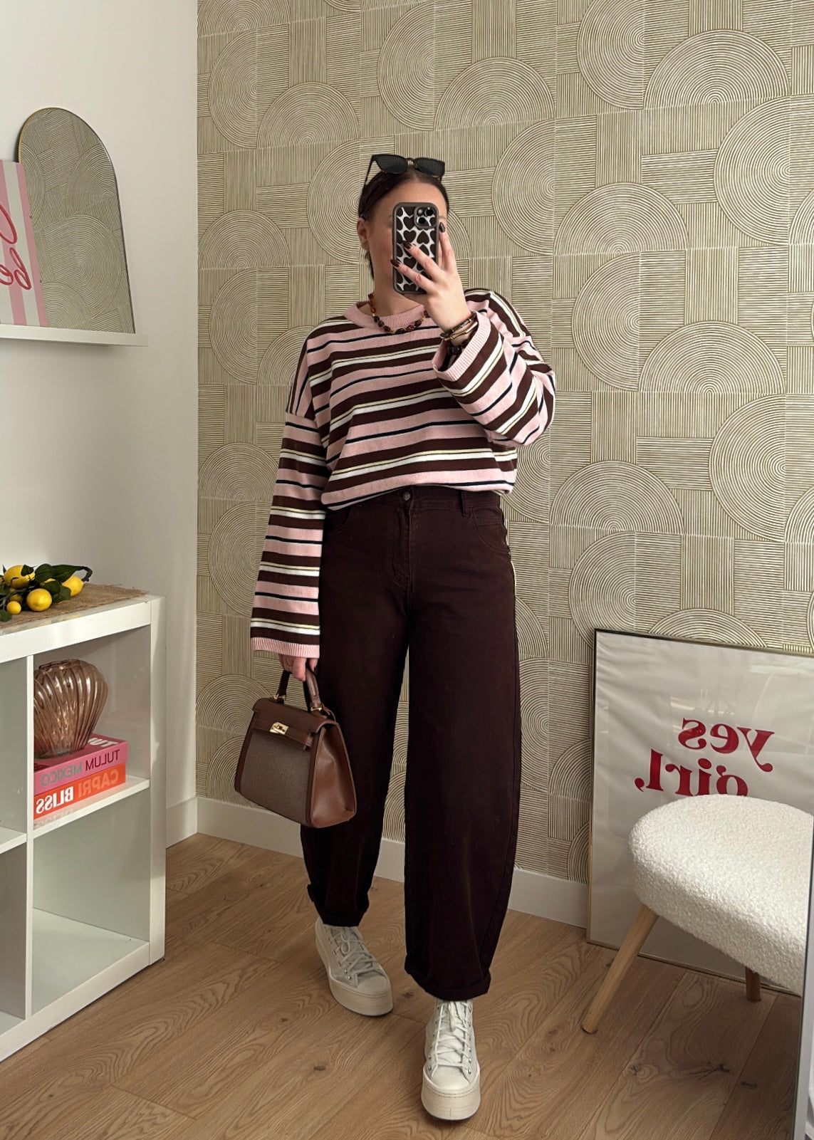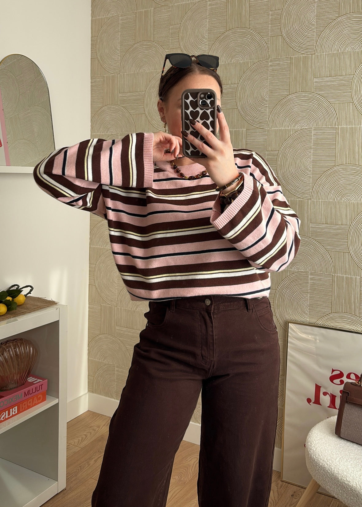 On craque pour ses rayures colorées rose et chocolat, ultra tendances cette saison, et sa maille fine toute douce. Sa coupe droite légèrement oversize en fait un allié confort, idéal avec un jean taille haute ou une jupe pour un look féminin et décontracté.