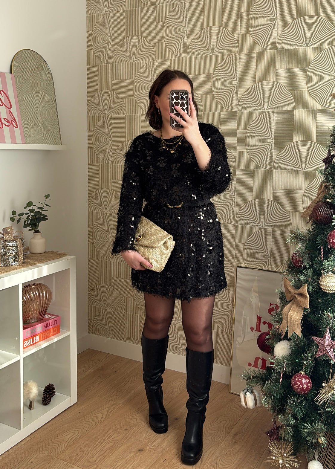 Le mélange de dentelle texturée et de sequins offre un contraste riche et lumineux. La coupe droite légèrement évasée assure un tombé flatteur, tandis que les manches longues transparentes ajoutent une touche chic et féminine. Parfaite pour les fêtes, un réveillon ou une soirée habillée.
