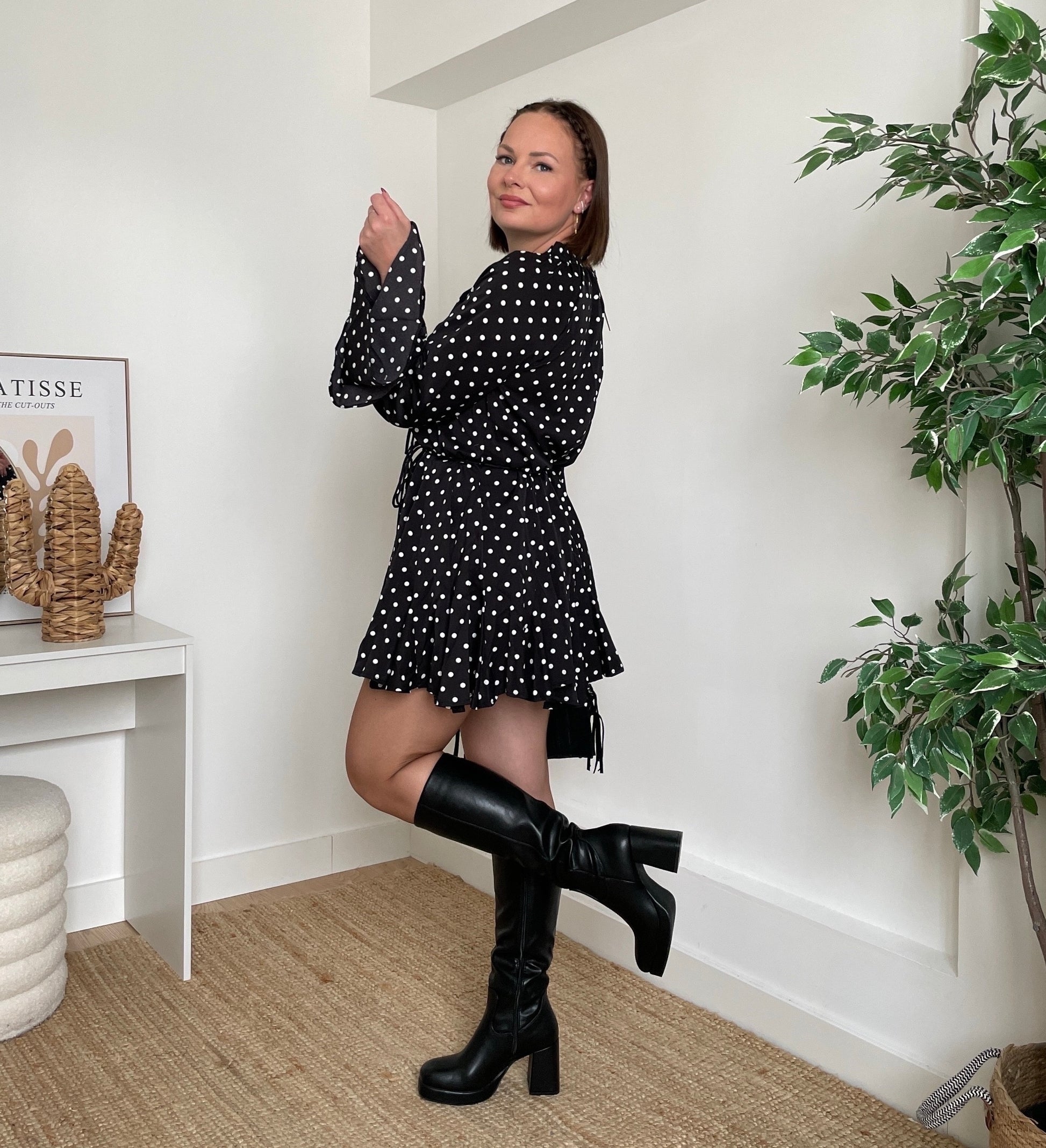 Une robe patineuse noire à pois, féminine et élégante, parfaite pour toutes les occasions