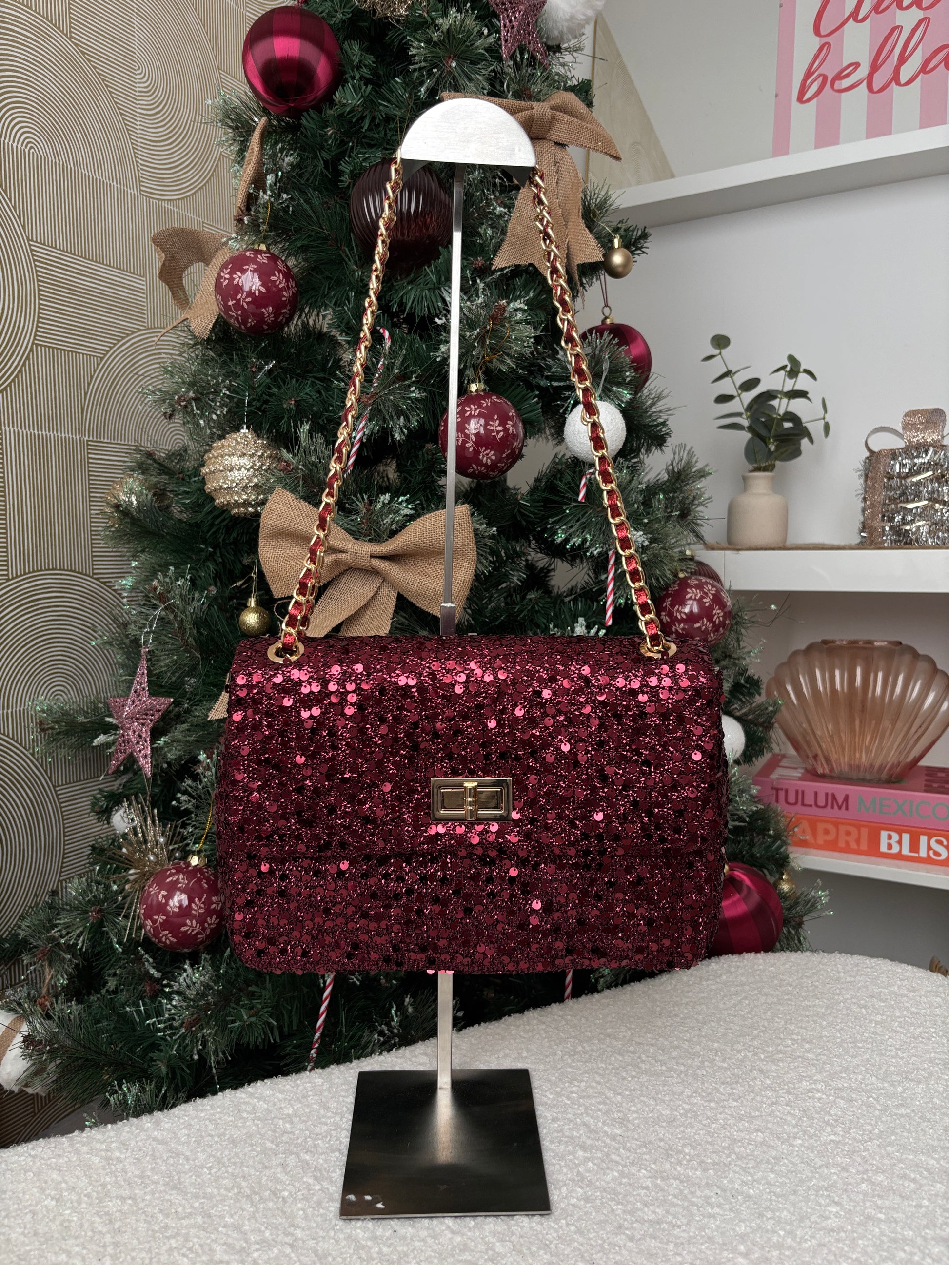 Entièrement recouvert de sequins bordeaux aux reflets lumineux, il apporte une touche glamour instantanée. Sa chaîne dorée entrelacée de tissu ajoute une finition élégante et festive.