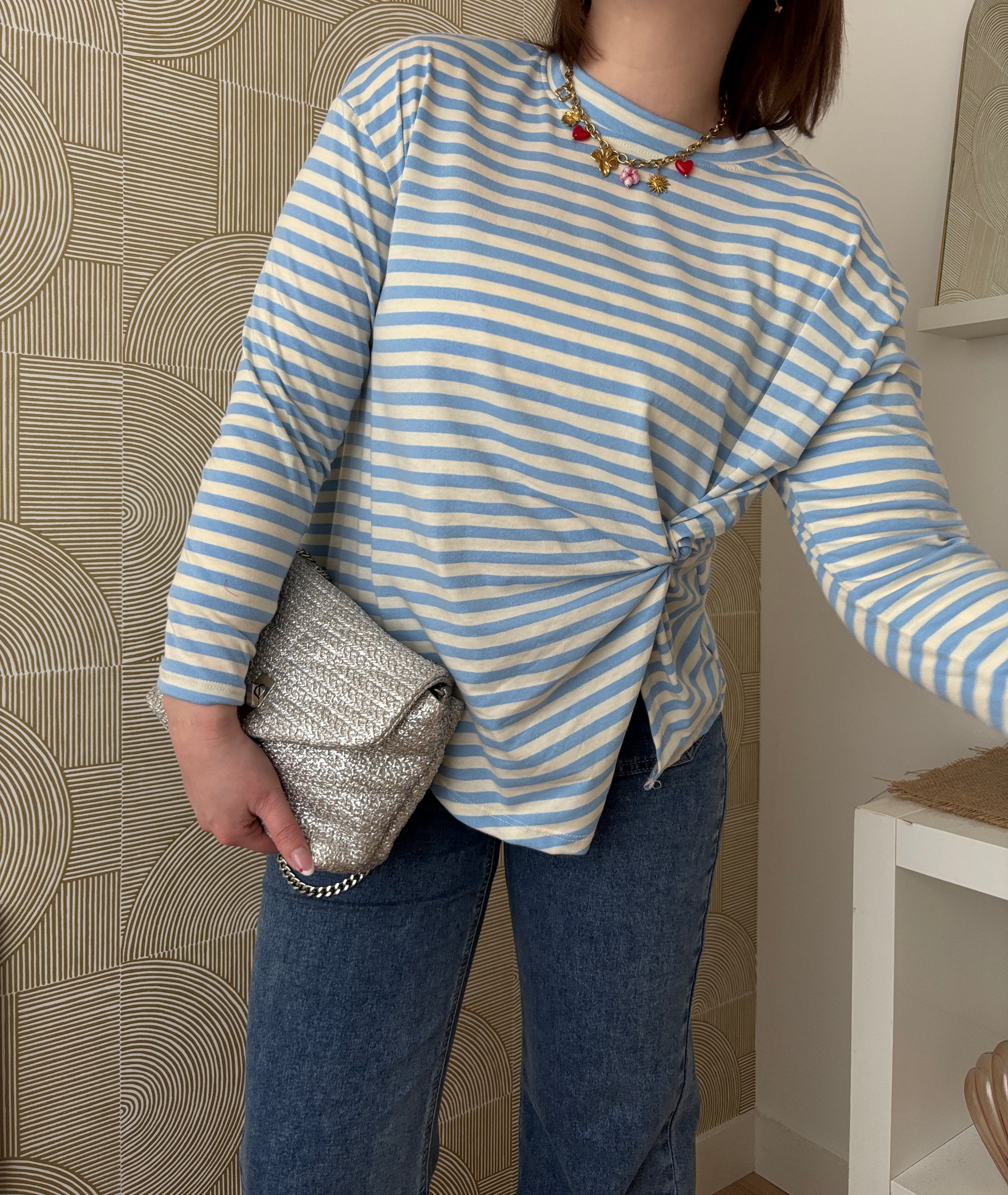 Ce top marinière bleu et écru apporte une touche fraîche et intemporelle à vos looks. Sa coupe fluide est sublimée par un joli détail drapé sur le côté qui structure la silhouette et affine visuellement la taille.